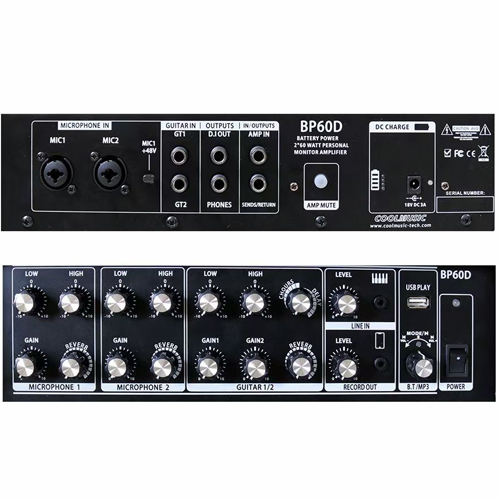 COOLMUSIC BP-60D is a versatile acoustic guitar amplifier. it has rechargeable lithium batteries inside, it can run to 6-8 hours for busking after full charged. 2 instruments input and 2 microphone plugins mean there’s much less equipment to carry. and it built in bluetooth and USB input can play background music. it added record functions, you can record what you played.